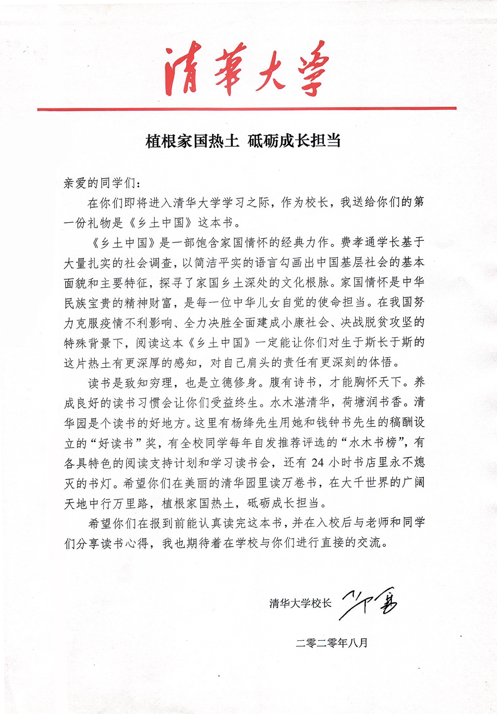 清华新闻网9月8日电(记者 冯哲盈) “亲爱的同学们,在你们即将进入清华大学学习之际,作为校长,我送给你们的第一份礼物是《乡土中国》这本书。”今年,清华2020级本科新生在疫情中收到了录取通知。淡紫色的录取信封中除了载着立体二校门的录取通知书,还有清华大学的传统迎新礼物——校长赠书。今年清华大学校长邱勇赠予新生的书是《乡土中国》。他在给新生的信中介绍了清华园的读书传统,并寄语新生“植根家国热土,砥砺成长担当”。
