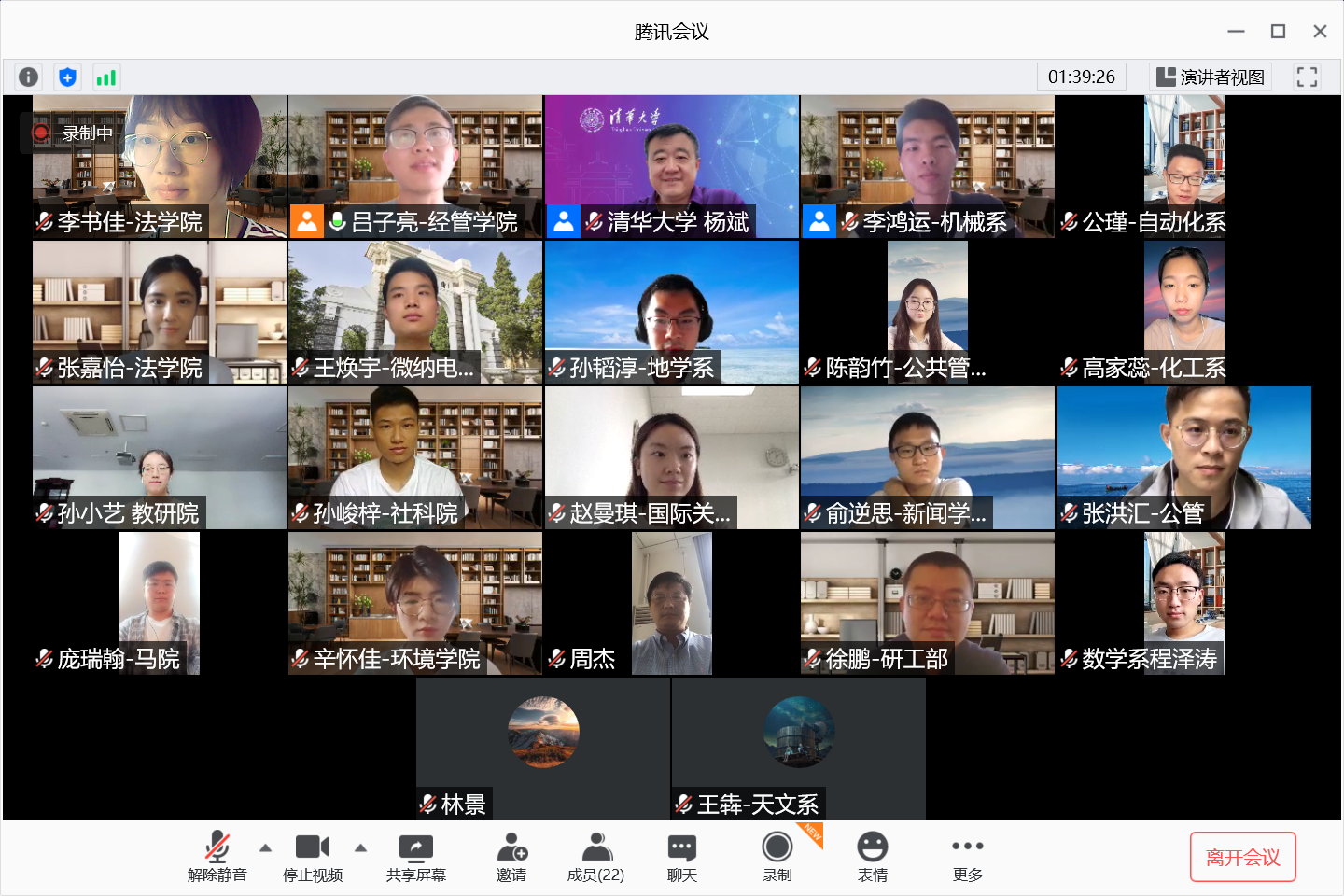 参会同学们分享了来到清华的入学初体验。开放包容的校园氛围和丰富多彩的新生教育活动使同学们迅速地融入校园,也深深地被清华文化和清华精神所打动。新闻学院2020级博士生俞逆思认为融入校园首先是要建立对学校文化底蕴的认同,并与自己未来的志向抱负产生心理上的联结,其次是通过在师门和学生组织中与集体共同陪伴和成长,最后是充分利用清华学科交叉资源,学习新知识,产生新想法并与本专业结合付诸实践。马克思主义学院2020级博士生庞瑞翰表示,“行胜于言”是清华给他上的第一课,这种生动深刻的精神将贯穿他在清华园的求学生涯,也将陪伴他一生。社科学院2020级硕士生孙峻梓说,暑期团校两周的学习让他心潮澎湃,清华的历史文化和清华人的家国情怀深深打动了他,暑期团校结束后,他坚定地提交了入党申请书。