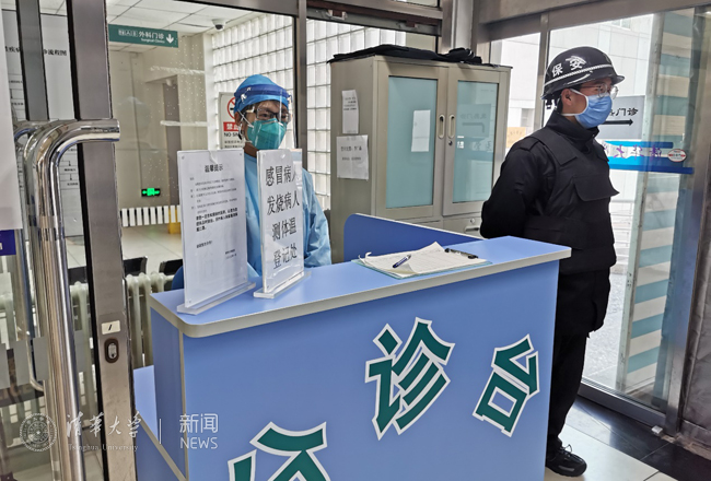 校医院发热门诊预检分诊护士和保安坚守岗位