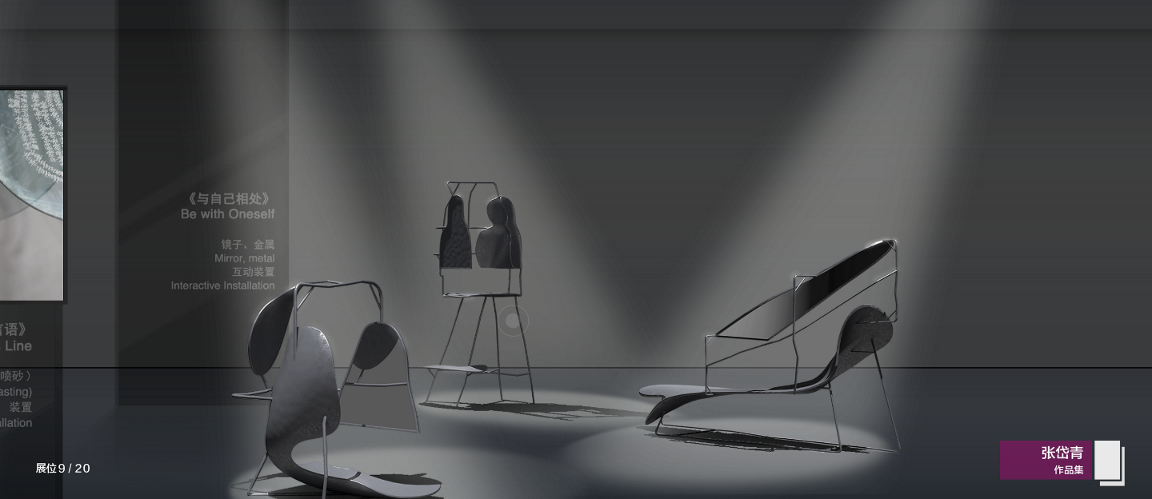 此外,线上布展更为自由,绘画、雕塑、装置作品、工业产品设计等均有相匹配的展陈形式。不过,线上展平台只提供虚拟空间和布展工具,只有作者最知道自己的作品如何展示效果最好。每张画、每件作品,每个屏幕,每堵墙,每个灯光,甚至每个交互,都是同学们自己亲手设计和布置的。