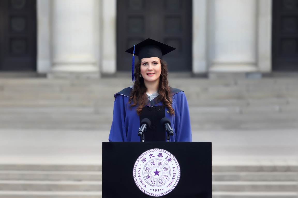 毕业生代表,医学院2019级硕士生、来自波黑的伊瓦娜分享了自己成长和求学的过程,特别讲述了疫情期间在校科研和生活以及拓展医疗领域国际合作的的经历。“我从未见过任何一个国家像中国这样,为扭转困境,人民心甘情愿团结一致牺牲个人利益,奉献个人力量……学校和中国政府制定的规则和方案,都是把每个人的健康和安全放在首位。”伊瓦娜说,“我谨代表我个人和全体毕业生,向清华大学、向中国政府,向这个自强不息、厚德载物的伟大文明表示衷心感谢。”伊瓦娜表示将铭记“行胜于言”的校风,为人类、为国际社会尽心竭力,为更加美好的未来、更加繁荣的世界而努力!