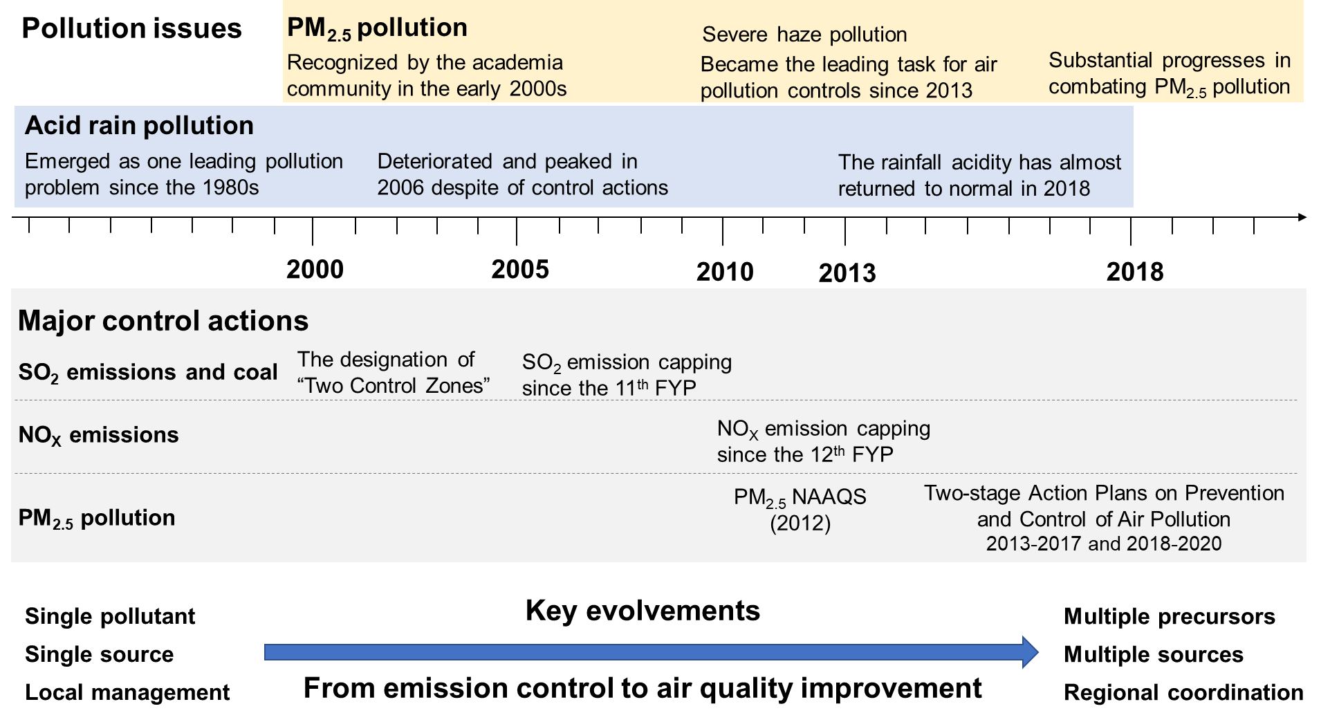 1980年以来,我国南方、西南等省份出现了大范围酸雨污染。2006年前,全国降雨平均pH值持续降低,峰值年(2006年)全国约1/3的区域面临酸雨问题,严重程度与中欧地区1980年代相当。燃煤污染排放的二氧化硫和氮氧化物是造成酸雨污染的主因。我国1995年修订大气污染防治法强化酸雨和燃煤污染控制,2000年划分了“酸雨和二氧化硫控制区”(即“两控区”划分)。十一五期间,国家实施了二氧化硫总量排放控制政策,强化对地方政府落实二氧化硫减排责任的政治考核,并通过一系列经济和技术手段成功遏制二氧化硫排放上升的趋势,酸雨污染逐渐好转。