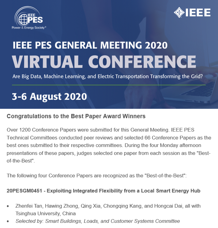 清华新闻网8月13日电 8月3-6日,国际电子电气工程师协会电力与能源学会年会(IEEE Power & Energy Society General Meeting)在线上召开。会上,清华大学电机系师生的论文“需求侧智慧能量枢纽综合灵活性研究”(Exploiting Integrated Flexibility from a Local Smart Energy Hub)获最佳论文奖(Best-of-the-Best)。论文第一作者为清华大学电机系博士生谭振飞,第二作者暨通讯作者为电机系钟海旺副教授,共同作者还包括电机系夏清教授、康重庆教授以及国网能源研究院有限公司代红才高工。该研究得到了国家自然科学基金和国家电网公司科技项目“综合能源系统多能转换模拟与综合能效评估技术研究”的资助。