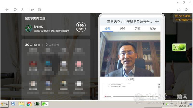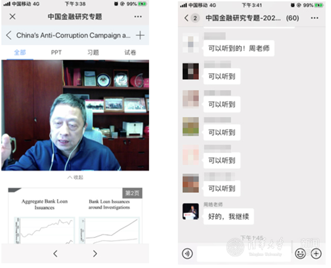 清华新闻网2月20日电 面对疫情给教学工作带来的特殊挑战,清华大学做出“延期开学、如期开课”的重要决定。为落实学校的整体安排,确保学院教学秩序的稳定,清华大学五道口金融学院全力推进在线教学工作。2月18日是学院线上开课第一天,学院共有五位教师的硕博课程在线上顺利开展。