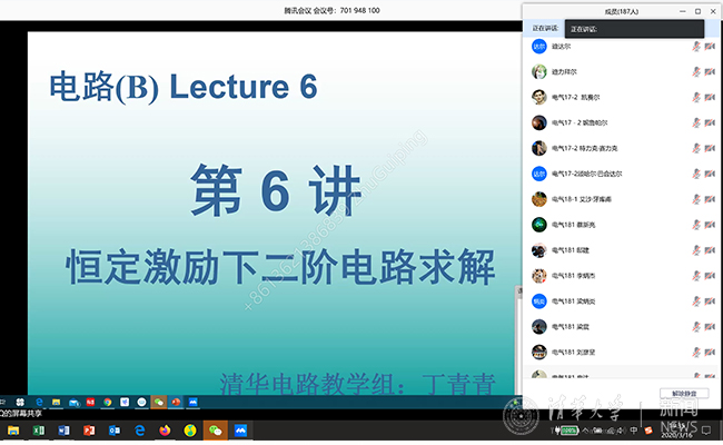清华新闻网3月17日电 3月16日星期一,19:40,随着预先设置的上课铃声响起,清华大学电机系副教授丁青青为新疆大学电气学院学生主讲的第一节网上直播课——“恒定激励下的二阶电路求解” 正式开始。