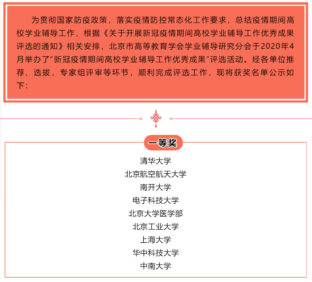 此次“新冠疫情期间高校学业辅导工作优秀成果”评选活动共有清华大学等30余所高校参与,旨在全面贯彻落实教育部指示,交流学业辅导经验成果,推进学业辅导工作规范化、精品化、科学化。