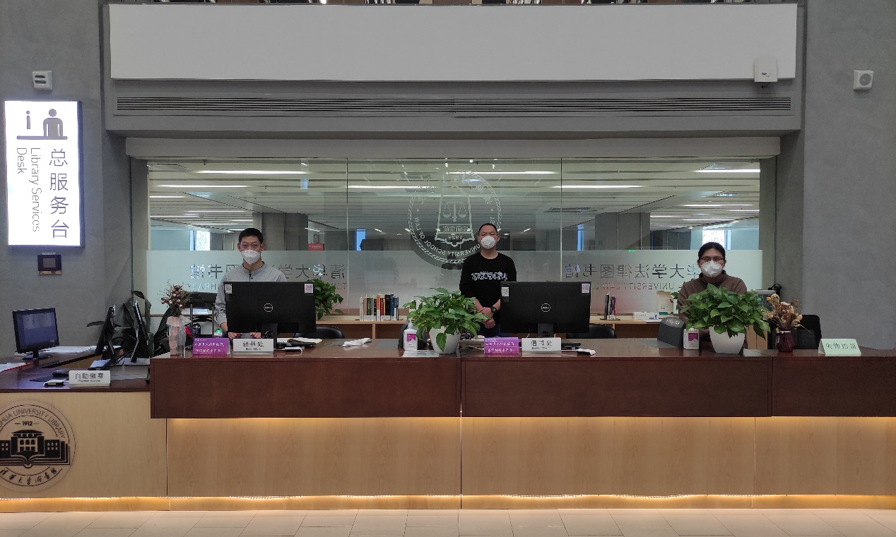 文科馆是同学们格外喜欢的自习场所,疫情期间仍保持较高的入馆人数和借还书量,在馆工作人员承担的业务量大,任务繁重。文科馆总服务台的吴晓飞主动承担了几乎所有晚班。年轻馆员贾虓涧和张帅、刘子正等外协人员一起,在多数同事不能到岗的情况下,身兼数任,除了负责借书、还书、咨询、保障总服务台流通外,还承担了落实入馆人员住处、发放物资等后勤工作,保障了自助文印业务的持续开展,以及配合学校流调等工作的开展。