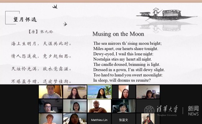 活动结束后,参与活动的中文导师和国际生们纷纷表示,这次线上跨文化交流体验令他们收获颇丰。中文导师高旭东说:“我带领的组员们对汉语诗歌非常感兴趣,他们在学习时不禁回想在自己的国家所见的‘明月’。这让我感到,诗歌的审美也是文化交流的一种重要方式。非常感谢‘汉语说’提供了一个非常好的交流之‘窗’,沟通了不同文化的‘梦’。”来自韩国的美术学院2019级硕士生金孝宣说:“今天我与来自中国的学生导师们一起学习了中国爱情诗歌,中国诗歌蕴含着甜蜜的情感,把我带入了梦幻的世界。在创作诗歌同时,我也提升了自己的语言审美能力,和大家一起学习汉语令我感到非常兴奋。”来自加拿大的软件学院2019级硕士生胡砚殊表示:“很高兴在疫情期间能通过‘汉语说’这种多样化的交互平台去学习和感受中国诗词和传统文化的魅力。‘海上生明月,天涯共此时’,读到这首诗,就想起了我的父母和同学,虽然大家天各一方,因为疫情不能相聚,但是看到的是同一轮明月。空间的距离也不能阻挡我们凝心聚力,共同对抗疫情,期待相聚在清华园的那一天!”