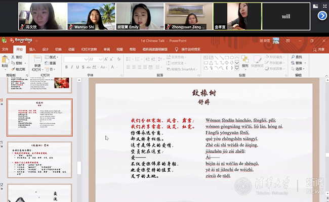 清华新闻网3月9日电(学生通讯员 张华夏)“蒹葭苍苍,白露为霜。所谓伊人,在水一方。”3月6日晚,一场别开生面的清华“汉语说”工作坊在“云”上举行。清华 “汉语说”活动由清华大学研究生会主办,为清华国际生打造了常态化汉语语境交互平台。在疫情防控的特殊时期,“汉语说”移步线上,通过网络搭建起了一座中外学生沟通交流的桥梁,让中外学生跨文化交流“不断线”。