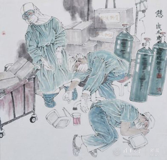 美术学院2017级博士后邓灿说:“选题过程中有一个反向和正向选择的过程。在这次疫情中美术界出现了大量与疫情相关的绘画作品,很多画家也表现过医护人员,多表现他们快节奏的工作场面,所以我想表现一个他们劳累后打盹的场面。”
