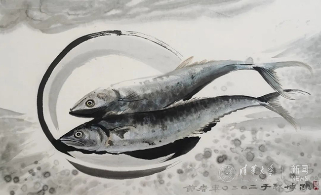 美术学院2017级硕士生陈博贤说:“它们仿佛挣扎在生存边缘,迫切地需要呼吸氧气,所以我在背景里为它们添加了一个海滩。这两条鱼就像那段新年中挣扎的病人,面对未知而恐惧,却充满生存的希望。”