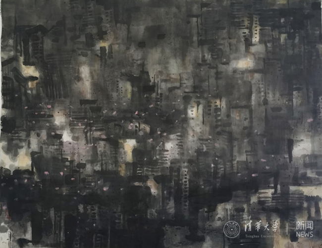 美术学院2017级硕士生陈博贤说:“作品展现了夜幕下的万家灯火,画面中浮动的樱花花瓣象征着春天的到来,展现作者对明天的美好祝福。”