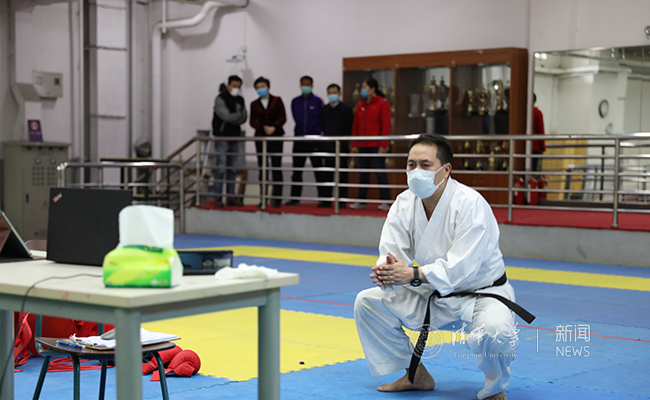 穿过体育部维学馆幽长的走道,在铺满黄蓝色软垫的训练大厅里,冯宏鹏老师坐在略显空旷的场地当中,对着小桌上的两台电脑正在进行在线教学。他娴熟地运用线上教学软件和设备,示范带领同学们进行“空手道入门”练习。