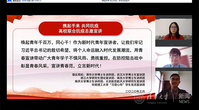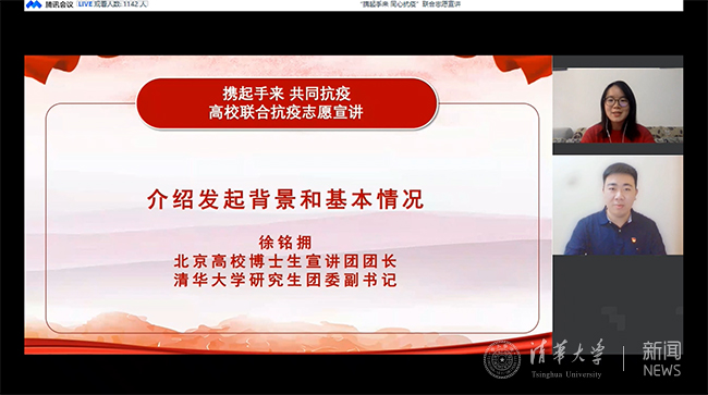 北京高校博士生宣讲团团长、清华大学研究生团委副书记徐铭拥介绍了系列宣讲的发起背景和基本情况。面对当前疫情形势,为汇聚高校青年宣讲合力,形成联合抗击疫情的良好氛围,清华大学博士生讲师团、武汉大学博士生宣讲团携手20余所高校的理论宣讲团,共同开展“携起手来 同心抗疫”高校联合抗疫志愿系列宣讲活动,旨在激励广大青年勇于担当作为。清华大学博士生讲师团团长盛忠凯、武汉大学博士生宣讲团团长周兵奇作为代表共同宣读了宣讲倡议《携起手来 同心抗疫 在防控阻击战中彰显青春风采》,鼓励新时代青年宣讲者,积极响应总书记号召,用青春宣讲带动广大青年学子不惧风雨、勇挑重担。