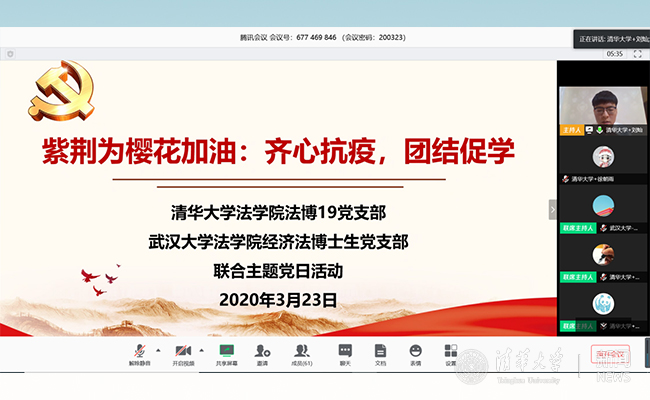 清华新闻网3月25日电(通讯员 谢明睿 刘灿)3月23日晚,清华大学法学院法博19党支部与武汉大学法学院经济法博士生党支部联合开展“紫荆为樱花加油:齐心抗‘疫’,团结促学”首场线上主题党日活动。清华大学法学院党委副书记王钢,武汉大学经济法教师党支部书记袁康,清华大学法学院法博19党支部带班助理袁义康,以及清华大学法学院法博19党支部、武汉大学法学院经济法博士生党支部共78名同学参加了本次会议。会议由清华大学法学院法博19党支部书记刘灿主持。