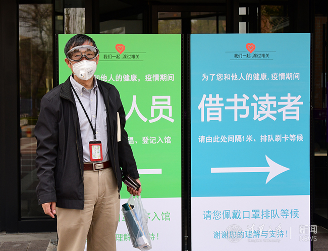 3月30日上午11时许,在北馆和文科图书馆门口,读者自觉按照要求佩戴口罩,刷卡借书。