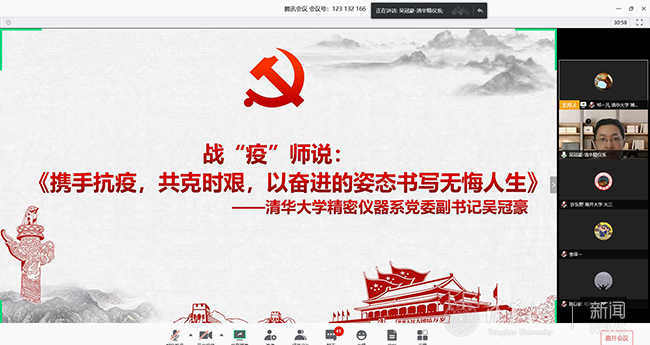 在交流提问环节里,同学们积极发表对于本次联合组织生活的感想。精密仪器系2019级博士生高晨心说:“这是一次具有特殊意义的组织生活会,虽然隔着屏幕,但是依旧能感受到老师与同学们的热情与力量。一个人的力量可能是渺小的,但一群人的力量一定是雄厚的。疫情面前,我们需要紧紧团结在一起,贡献各自的一份力量。期待春暖花开,疫情消散,我们线下再会。”