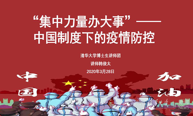 博士生讲师团讲师、清华大学水利系2018级研究生韩俊太以“‘集中力量办大事’——中国制度下的疫情防控”为题进行分享。报告中提到,对口援建是中国制度优势的体现,全国一盘棋是社会主义制度集中力量办大事的显著优势。我们要坚定贯彻“四个意识”““四个自信”“两个维护”,完善和发展中国特色社会主义制度,推进国家治理体系和治理能力现代化。
