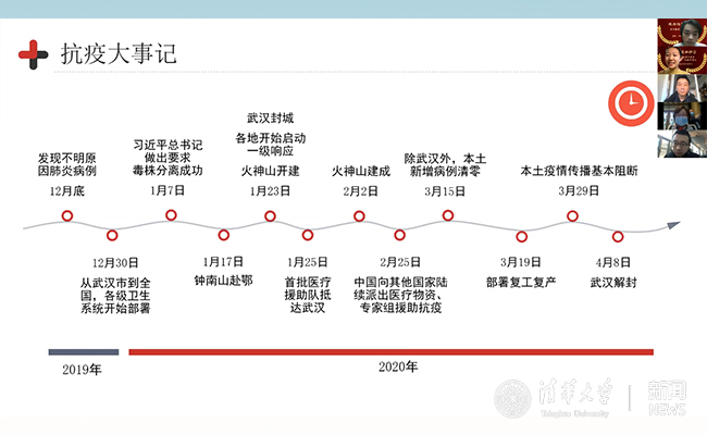 在主题团日的活动中,同学们共同回顾了抗“疫”以来发生的各种重大事件,以及清华大学在抗“疫”中所作出的种种贡献。清华师生始终与国家、与人民站在一起,为抗击疫情作出自己的努力,他们当中有的奔赴前线,有的科研战“疫”,有的保障后勤,而更多的同学们则在自己的家乡为抗击疫情尽己所能、随时准备着。在疫情当中,清华师生的种种作为展现了清华人的使命感,也展现了中国青年一代的责任与担当。