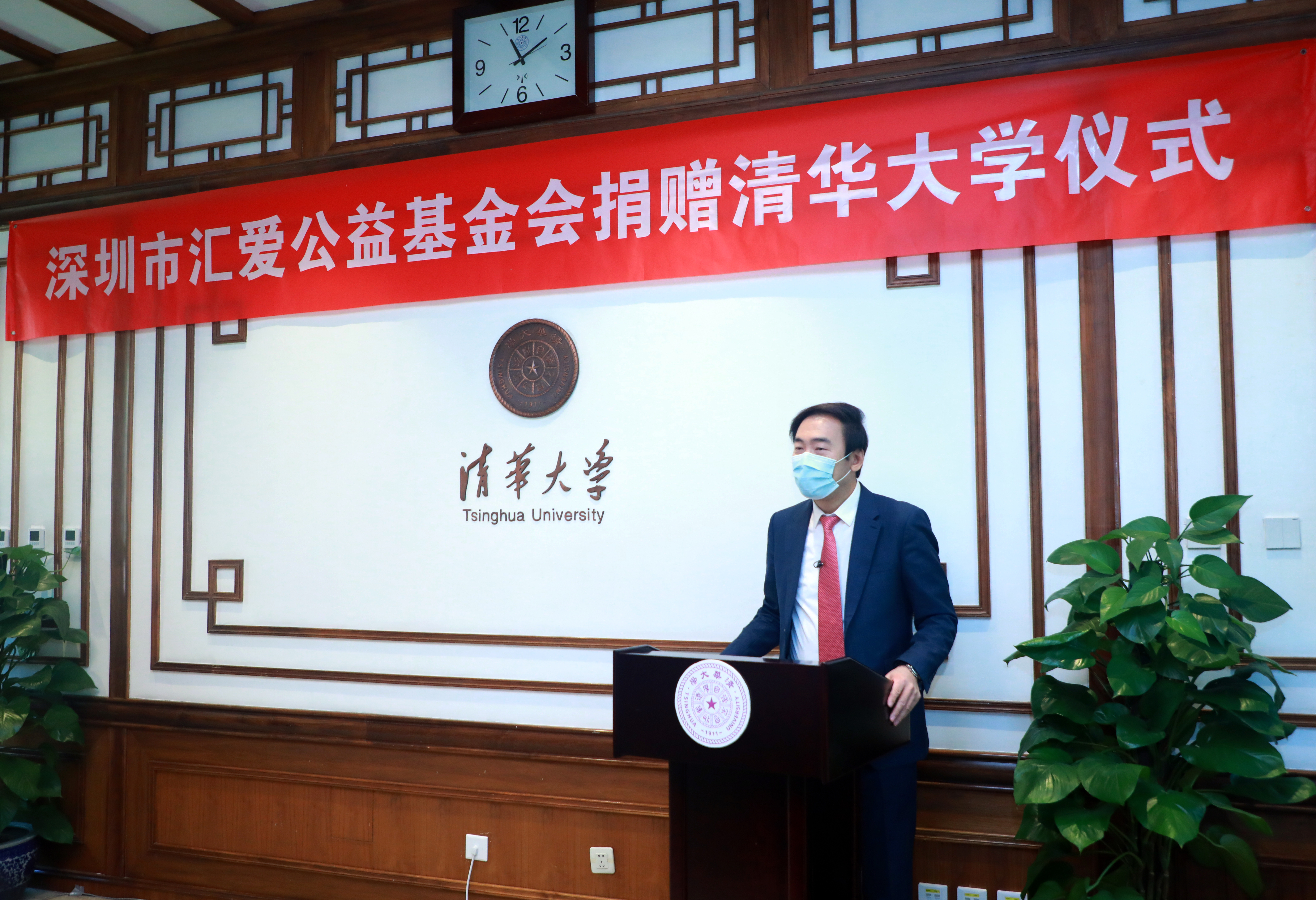 邱勇首先代表学校向邓锋校友及汇爱公益基金会表示衷心感谢。他指出,在抗击疫情的特殊时期清华大学迎来了109周年校庆,汇爱公益基金会的捐赠既让我们感到喜悦也令我们充满感激,这是清华校庆收到的一份重要且有时代意义的捐赠。