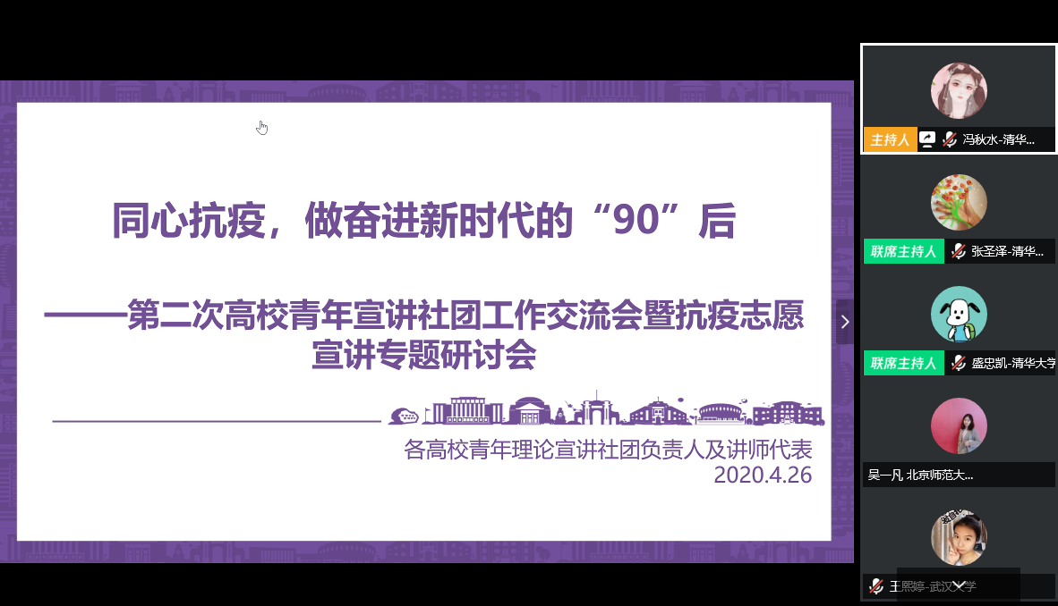 清华新闻网5月6日电 为抗击疫情贡献青年力量、汇聚高校青年宣讲合力,清华大学博士生讲师团联合40余所高校的学生理论宣讲团已开展12场高校联合抗疫志愿宣讲会,覆盖近20000名学子。在五四青年节来临之际,4月26日下午,清华大学博士生讲师团组织开展了“同心抗疫,做奋进新时代的‘90后’”高校青年宣讲社团讲师交流会暨抗疫志愿宣讲专题研讨会。
