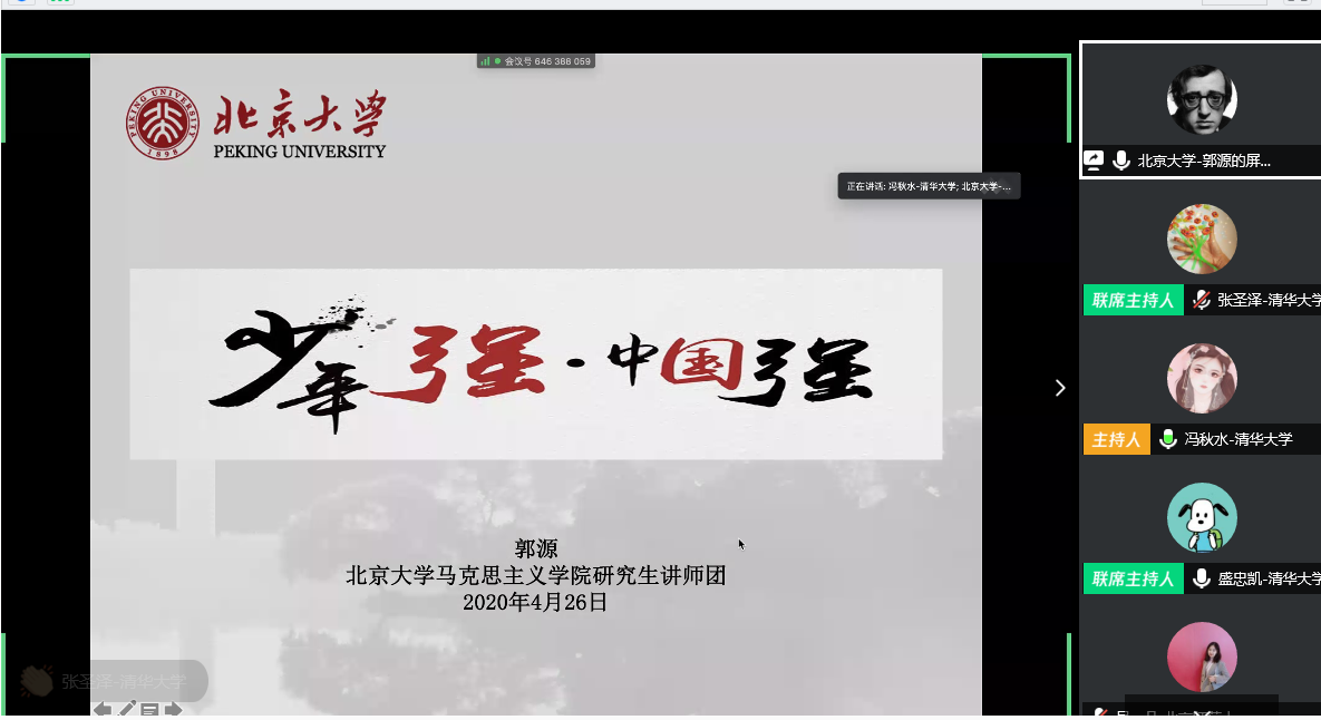盛忠凯以“科技支撑抗击疫情”主题,围绕学习习近平总书记考察调研清华大学新冠肺炎防控科研攻关工作时的重要讲话精神进行分享。北京大学马克思主义学院研究生讲师团郭源以“少年强中国强”为主题进行分享,讲述了习近平总书记给北大援鄂医疗队的回信和去信主笔人的故事,激励青年为实现理想而奋斗。