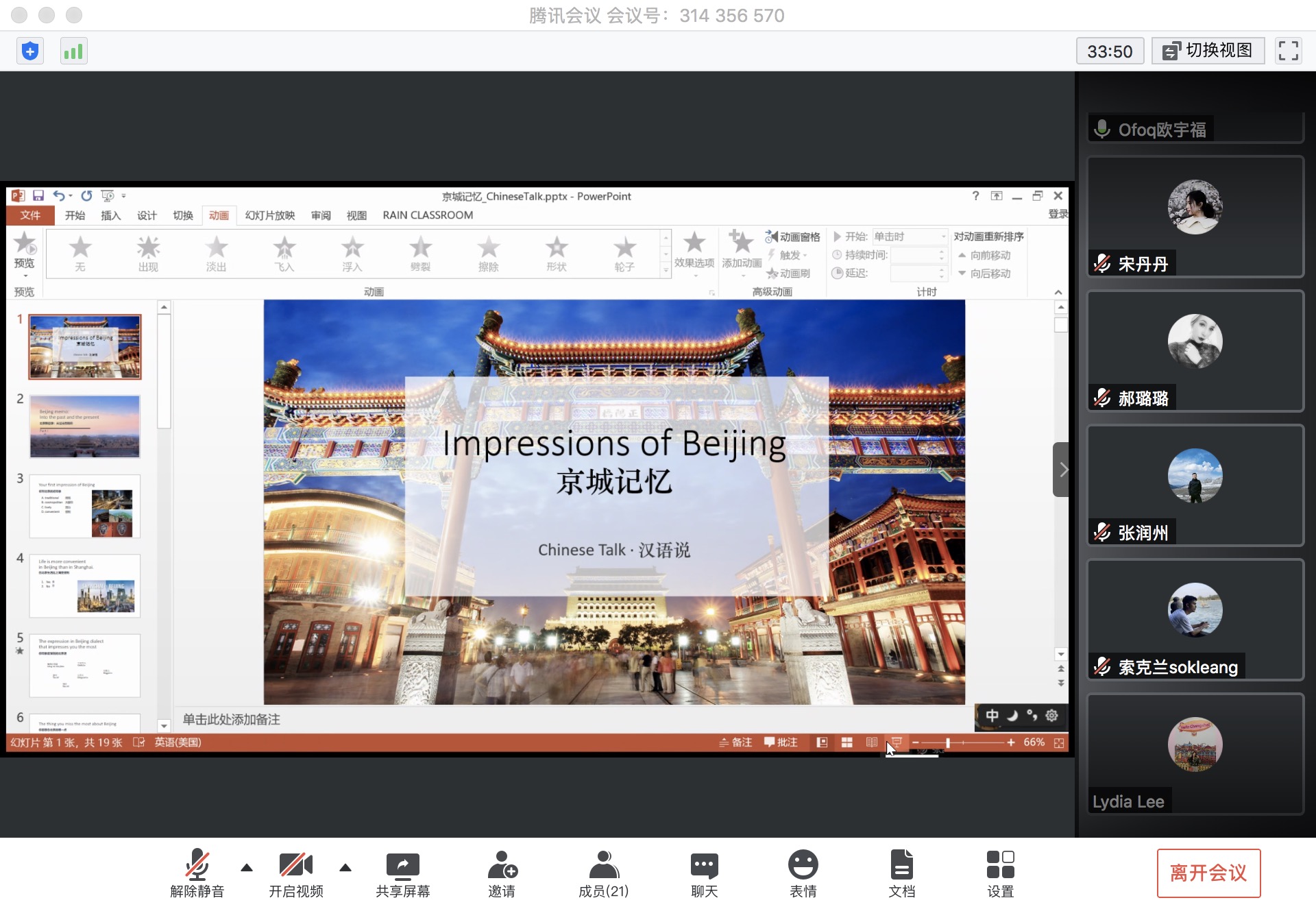本次活动由人文学院2017级硕士生应远帆担任中文导师,他从北京美景美食和语言文化入手,带领身处世界各地的国际生同学云游北京。随后,中文导师引导国际生交流北京的生活记忆,并帮助他们理解有趣的北京话,唤醒了国际生同学们许多对北京、对校园的回忆,也鼓励大家相互交流防控隔离期间的体验与期待,中外同学共同度过了一段难忘的“云上汉语说”时光。