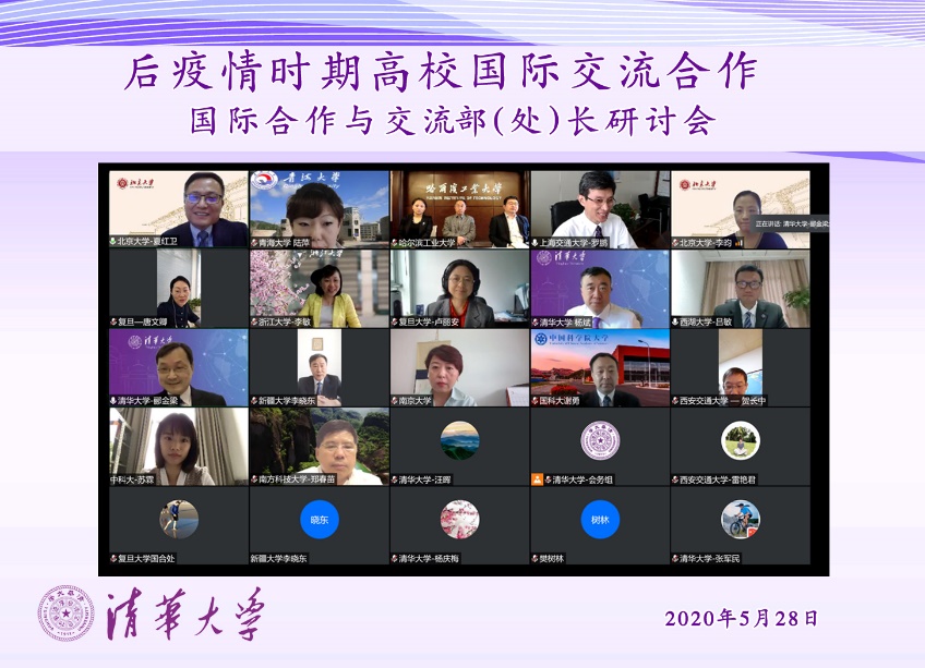 清华新闻网5月30日电 5月28日,由清华大学主办的后疫情时期高校国际交流合作暨国际合作与交流部(处)长研讨会在线上举行。北京大学、清华大学、复旦大学、上海交通大学、南京大学、浙江大学、中国科学技术大学、哈尔滨工业大学、西安交通大学、中国科学院大学、南方科技大学、西湖大学、新疆大学、青海大学等14所高校国际合作与交流工作负责人参加会议。清华大学副校长、教务长杨斌出席会议并致辞,清华大学国际合作与交流处处长郦金梁主持会议。