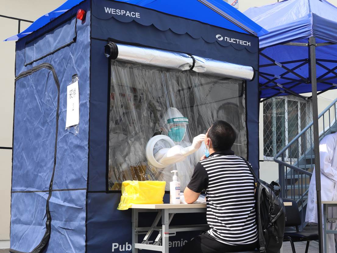 清华大学校医院医护人员在同方威视防疫检测移动舱内进行核酸检测工作
