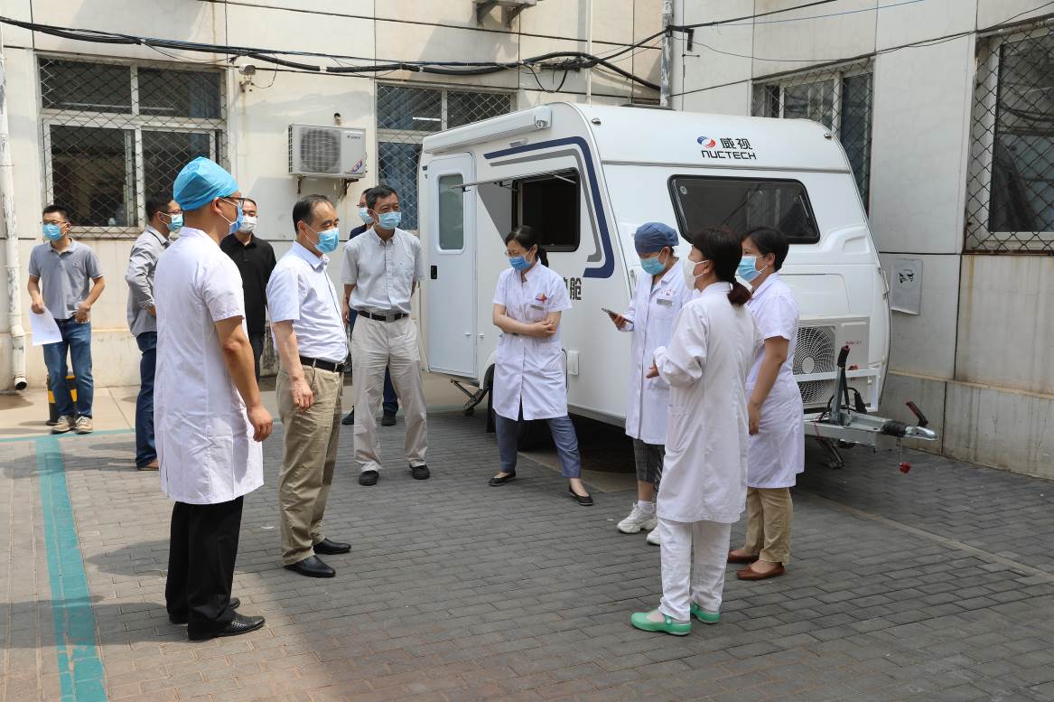 6月22日上午,清华大学副校长吉俊民带队视察了清华大学校医院,对校医院医护人员进行了亲切慰问,并视察了校医院新装备的采样隔离设备。