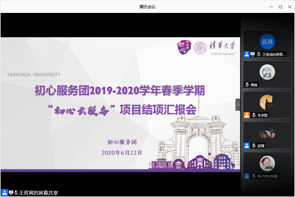 清华新闻网6月26日电 (通讯员 车宗凯 曾姝 程少逸)6月22日,清华大学初心服务团2019-2020学年春季学期“初心云服务”项目结项汇报会在线上举行。校团委副书记、研团委书记赵璞,校党委研工部校地综合办主任、研团委副书记张秀吉参加汇报会。汇报会上,7支项目支队围绕一学期的“云服务”成果作了汇报和总结。
