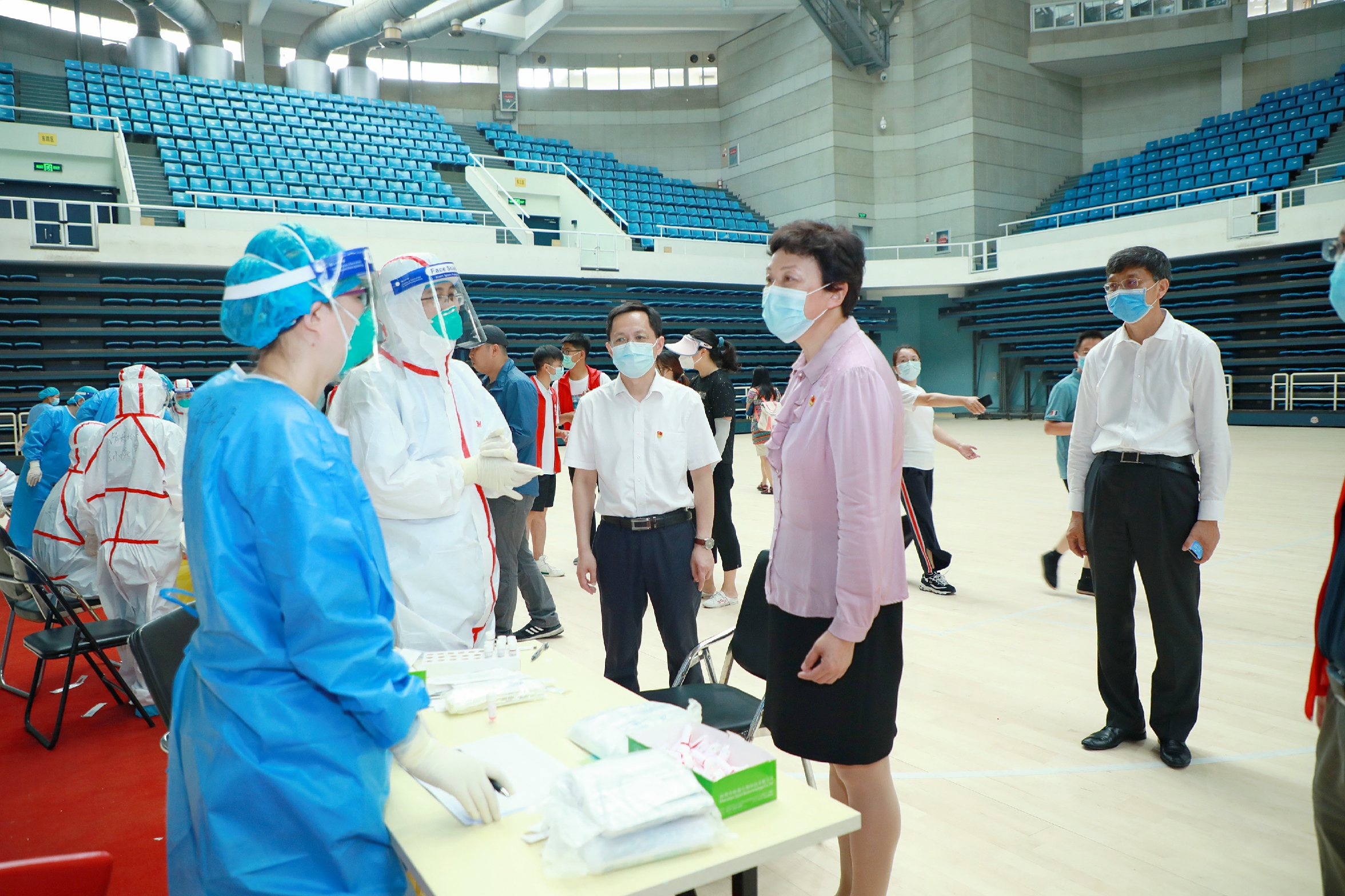 27日上午,陈旭、王希勤一行检查集中核酸检测工作