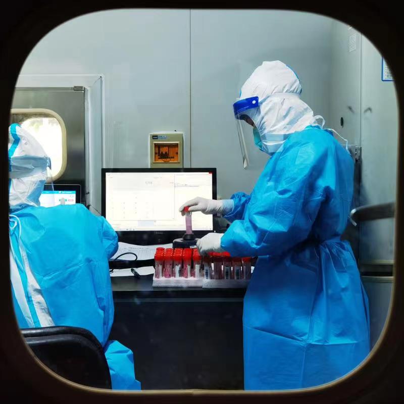五月以来,检验科的18位医务人员,除了一人休产假、三位因年龄较大不便进入方舱工作的老同志负责保障科室日常门急诊工作,其余14人集体上阵,全部投身核酸检测工作之中。