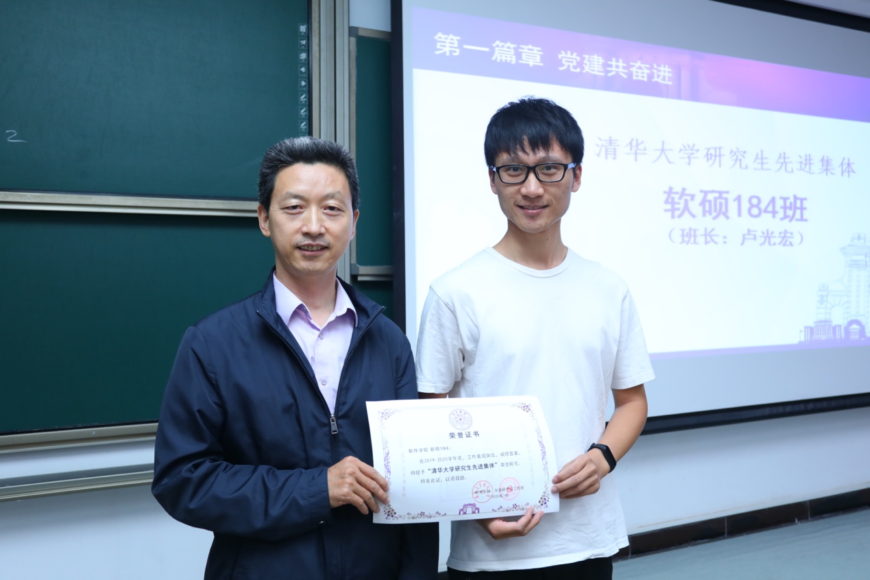 在党团班集体荣誉展示与颁奖环节,王建民为获得研究生先进集体的软硕184班班长卢光宏颁奖。卢光宏结合“图算法”,用具有软件学院专业特色的方式向大家展示了如何将班级中孤单的“点”相互连接成“线”,最终形成一个班级的“面”,从而提升凝聚力的完整过程。随后,同学们通过观看视频,了解和学习了上一年度考核优秀的党支部的丰富故事。