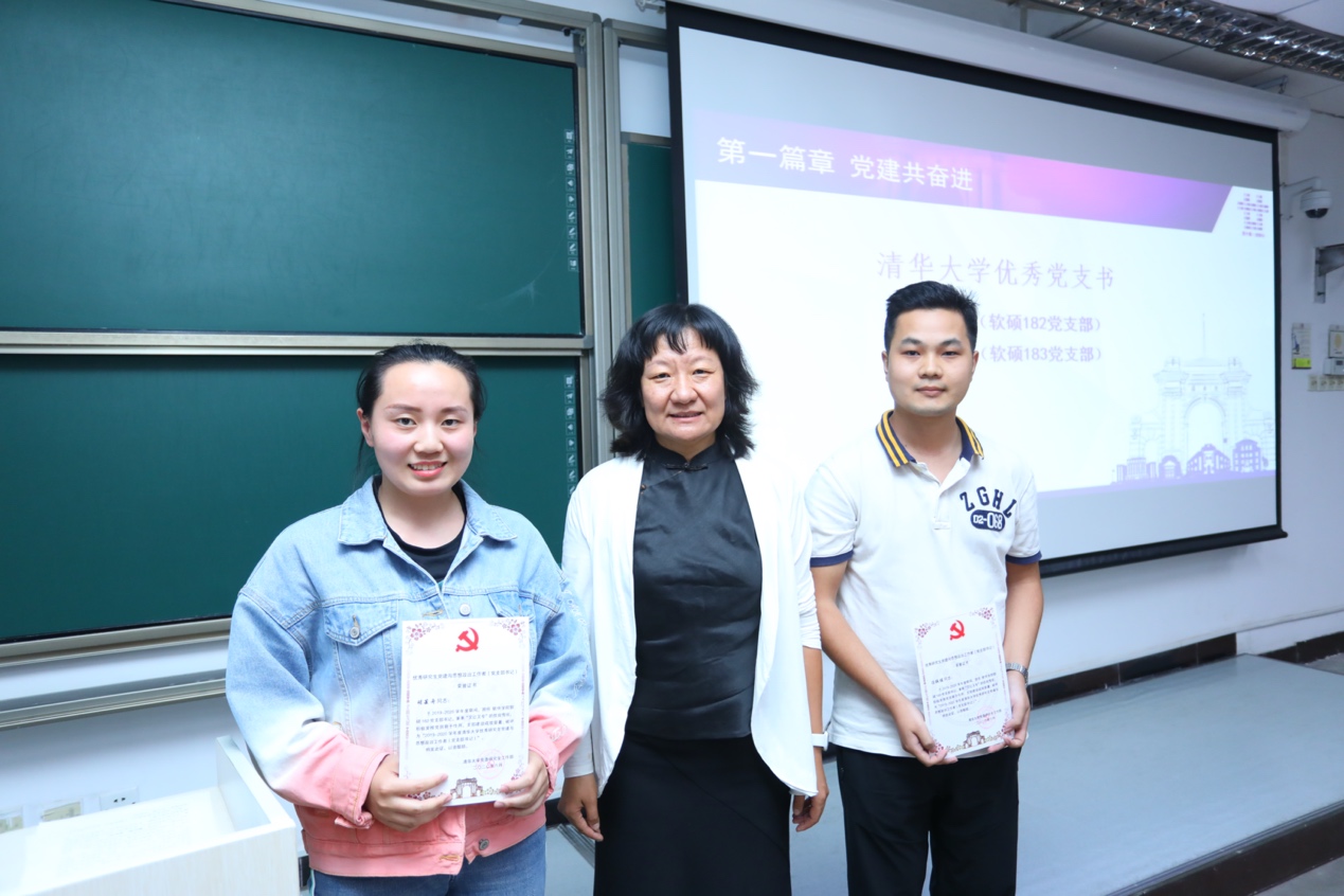在个人荣誉展示与颁奖环节,刘璘向获得优秀党支书荣誉称号的同学们颁奖,软硕182党支部书记琚芸舟、软硕183党支部书记冯铖锃分别从党支部建设、党组织生活等方面分享了自己担任党支书的心得。