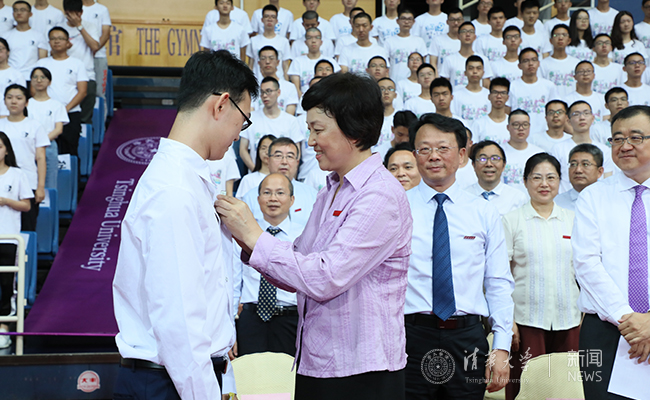 校党委书记陈旭为本科新生代表戴上校徽