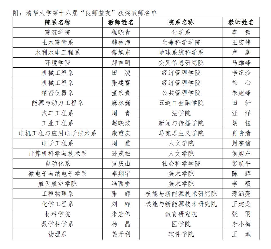 清华新闻网6月12日电 经过一个多月的院系自由提名、复评投票(含师德宣讲)等阶段,清华大学第十六届“良师益友”评选结果于近期揭晓,建筑学院程晓青等来自37个院系的42位教师获“良师益友”称号。