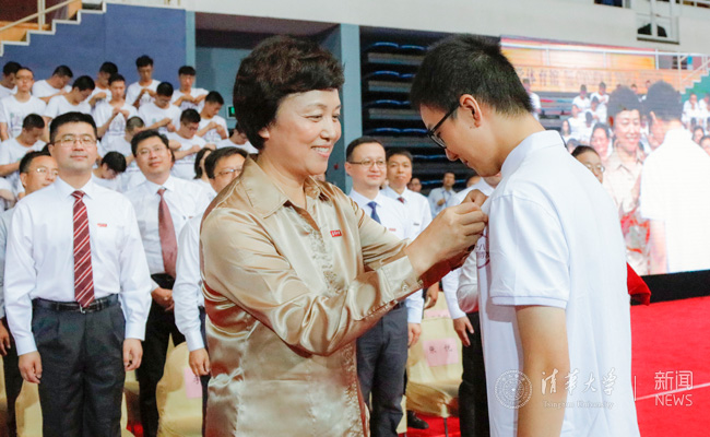 今年的开学典礼首次安排全体新同学佩戴校徽。校徽不仅代表着“清华人”的身份,更承载着清华“自强不息,厚德载物”的精神,承载着清华人的使命与荣光。校党委书记陈旭在典礼上亲手为新生代表陈开佩戴上清华大学校徽。