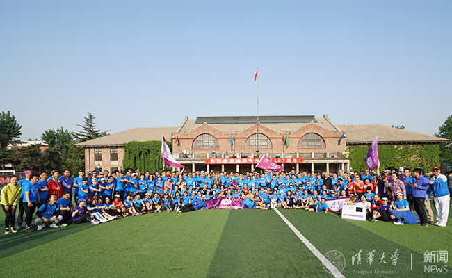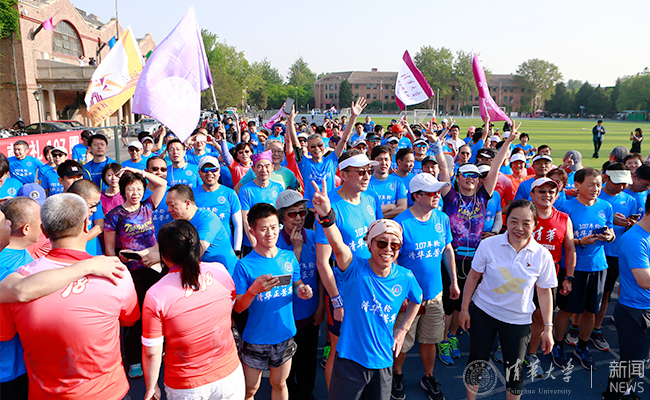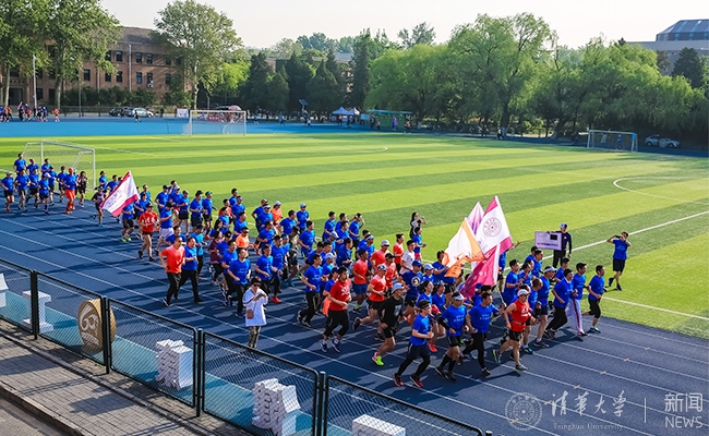 西大操场彩旗飘飘,人声鼎沸。大家身着统一的服装,简短热身后,活动正式开始。清华大学党委书记陈旭,清华校友总会秘书长唐杰,校友总会副秘书长崔剑、陈伟强,体育部主任刘波、副主任胡凯等与300多名师生校友一同站在了起跑线上。