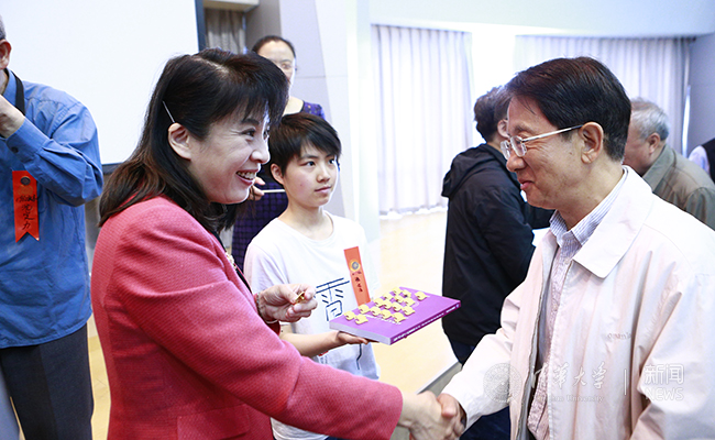 陈旭为老校友佩戴纪念徽章 记者 张帆 摄