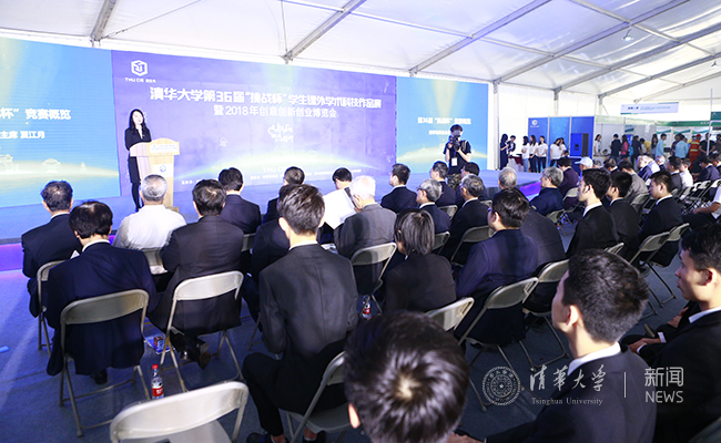 清华新闻网4月29日电 4月29日上午,清华大学第36届“挑战杯”学生课外学术科技作品展暨2018年创意创新创业博览会(THU CIE 2018)开幕仪式在游泳馆前南广场举行。校领导邱勇、陈旭、姜胜耀、邓卫、吉俊民、杨斌、李一兵、尤政、王希勤、过勇。校务委员会副主任谢维和、史宗恺,老领导王大中、贺美英、杨家庆、张思敬、张慕葏、黄圣伦、王凤生、余寿文、胡显章、关志成、张再兴、郑燕康、孙道祥等出席。