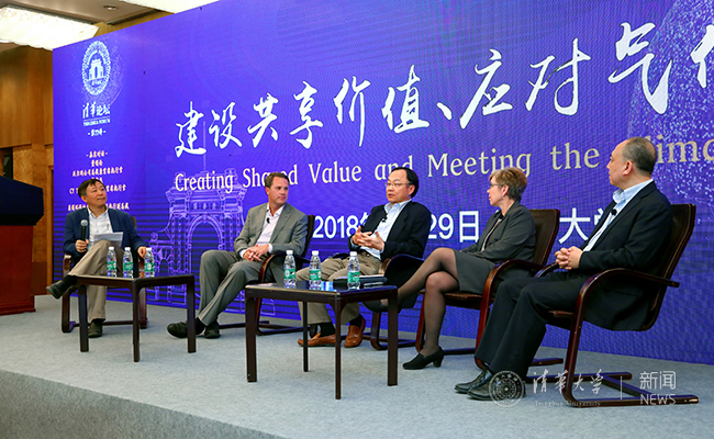 演讲结束后举行了嘉宾对话,参加对话的嘉宾有董明伦、宫鹏、CY TOP有限责任公司首席执行官韩宏远、美国环保协会(EDF)全球执行副总裁格温·露塔(Gwen Ruta)、清华大学公共管理学院教授齐晔。对话就沃尔玛的全球减排计划、各方参与全球减排合作的重要性等问题展开。