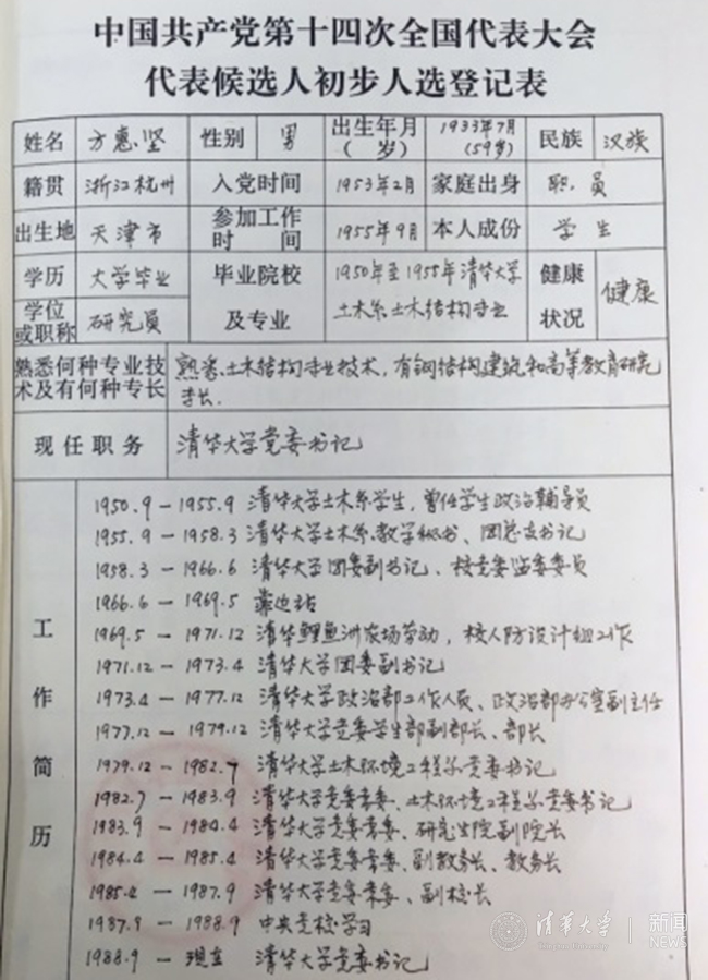 方惠坚(1933- ),1950年入清华大学土木系学习,1953年入党,并成为首批学生政治辅导员,毕业后留校任教。曾任校团委副书记、校党委监委委员、党委学生部部长、外事办公室主任、土木环境系党委书记、研究生院副院长、教务长、常务副校长等,1988-1995年任校党委书记。