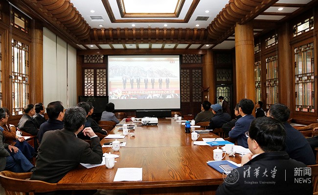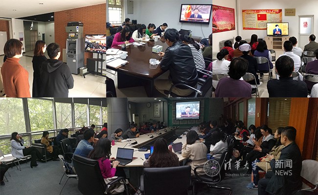 清华新闻网10月26日电 10月25日上午,中国共产党第十九届中央委员会第一次全体会议举行,新当选的中共中央总书记习近平和各位常委同中外记者见面,习近平总书记代表中国共产党第十九届中央委员会致辞。清华大学党委理论学习中心组成员与学校老领导在工字厅东厅共同收看了十九届中央政治局常委与中外记者见面会直播。清华全校师生聚集在各会议室、办公室和实验室,围坐收看见面会实况。全校师生对新一届中央领导集体坚决拥护、充满信心,不忘初心跟党走,牢记使命谱新篇。