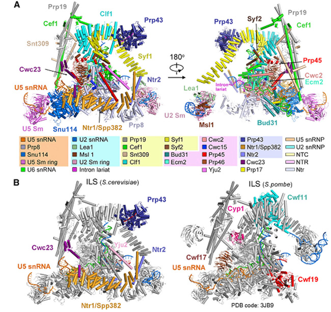 2017年9月15日,生命学院施一公教授研究组于《细胞》(Cell)杂志就剪接体的结构与机理研究再发最新成果,报道RNA剪接循环中剪接体最后一个状态的高分辨率三维结构,为阐明剪接体完成催化功能后受控解聚的分子机制提供了结构基础。