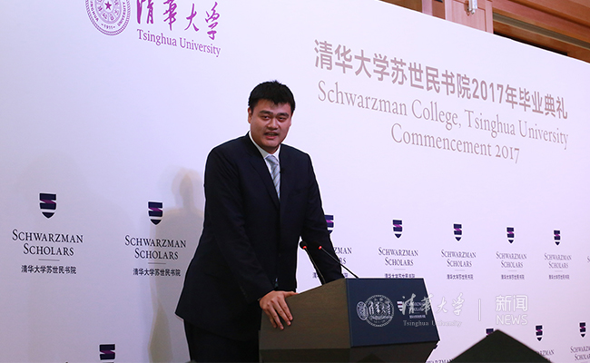 杨斌副校长向大家隆重介绍了演讲嘉宾姚明,形容姚明是沟通中外的一位当之无愧的文化大使,是中国与世界之间的一座非常高大的桥梁。杨斌说:“对于在座的苏世民毕业生来说,他就是我们希望你们将来扮演的角色。”