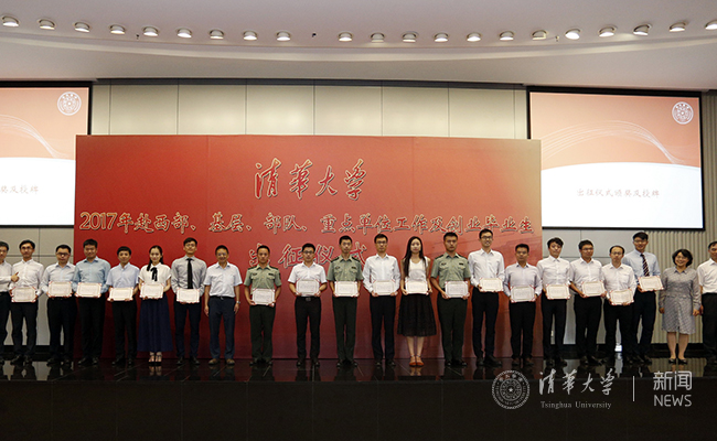 长期以来,清华大学高度重视毕业生就业创业工作,将其摆在关系学校发展的战略位置上,在确保毕业生充分就业的前提下,大力引导毕业生到西部、到基层、到祖国最需要的地方去建功立业。2004年,学校为鼓励作出有方向性意义就业选择的毕业生,设立启航奖并隆重举办出征仪式。2017年的18位启航奖金奖获得者中有8人前往西部艰苦行业或基层岗位工作,2人选择创业,4人选择到高校或科研单位工作,2人选择去重点国企工作。