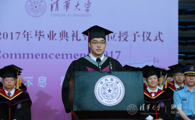 数学系2017届本科毕业生肖翰珅作为毕业生代表发言。他说,四年的清华求学经历告诉自己:只有去走难走的路,才能看到更多更美的风景。他表示,感谢清华给予的质朴和责任,自己愿意承担起更多更大的使命。面对未来千千万万条路,我们会永远选择那条最难走的路,自迩而远,自卑而高,领略难寻的风景,实现最美的初衷!