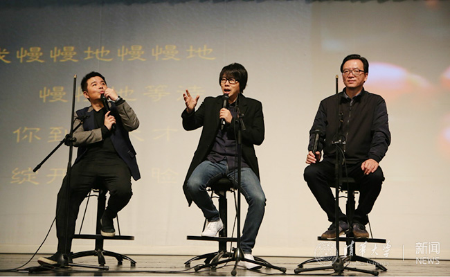 蒙民伟音乐厅邱柯、卢庚戌、缪杰——与同学们聊关于校园民谣的那些事儿。杨艳宾