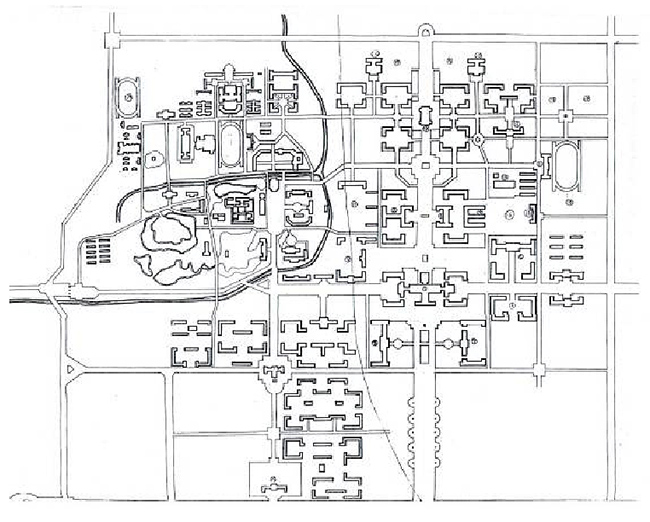 改造原有河湖水系与自然地形,构成以荒岛为中心的西湖、教工住宅区的南湖与主楼北部学生宿舍区的东湖,围绕湖区设置绿化中心和风景区,三湖并以河道相连。